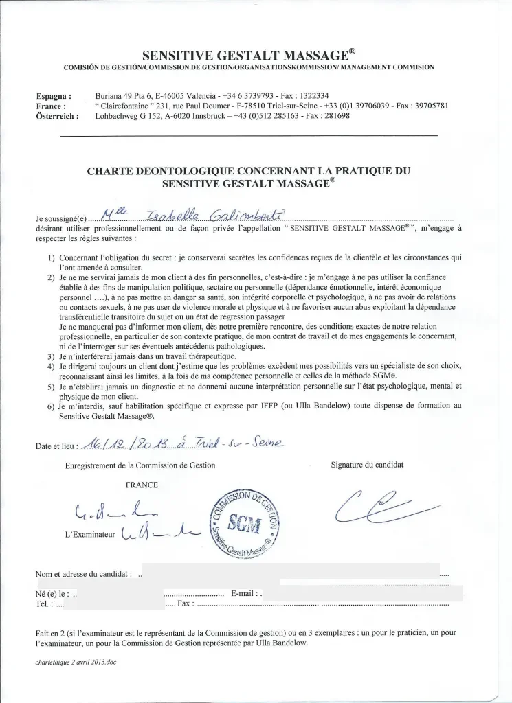 En tant que praticienne certifiée en Sensitive Gestalt Massage®, je respecte la charte déontologique de l’Institut Français de Formation Psychocorporelle.